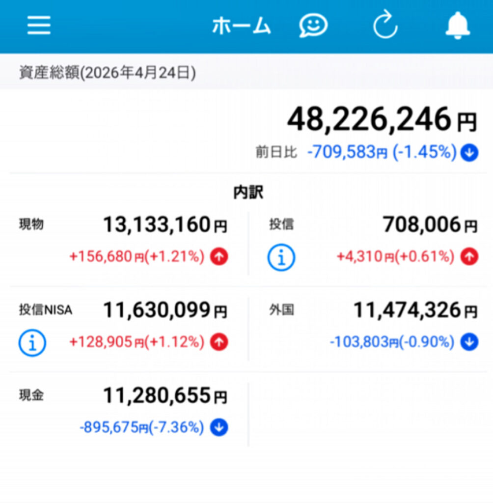私の現在です!! Uncategorized X Facebook はてブ LINE Pinterest コピー 2026.04.26 米国、日本株最高値付近ですね!! 今は現金比率を高め次の弱き相場に備えます!!